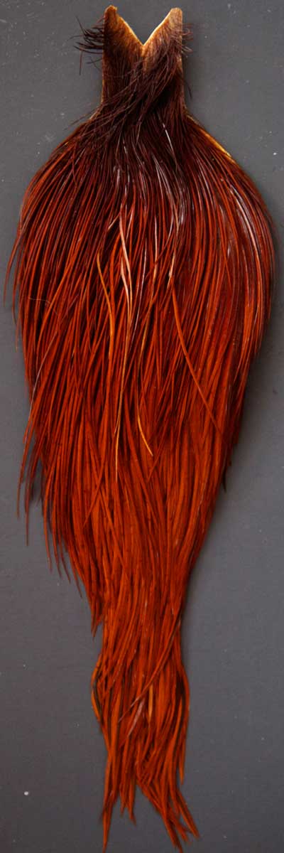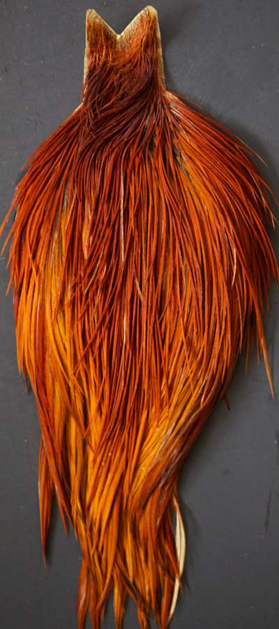 Here's a nice dark ginger. The feathers on this cape are long, especially the small sizes. These Whiting capes are the same high quality capes you saw at the fly fishing shows. Graded on the old standard of #1, #2, and #3, according to the number of flies you can tie from the cape, you won't find a better deal anywhere!
