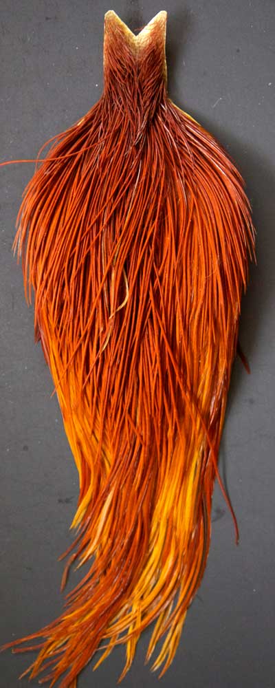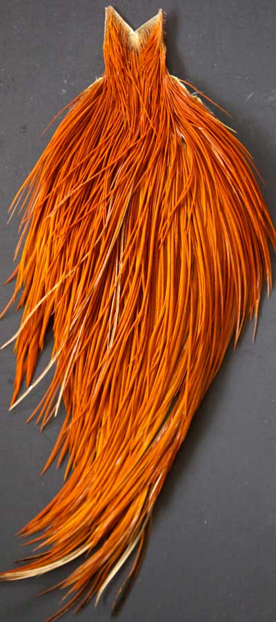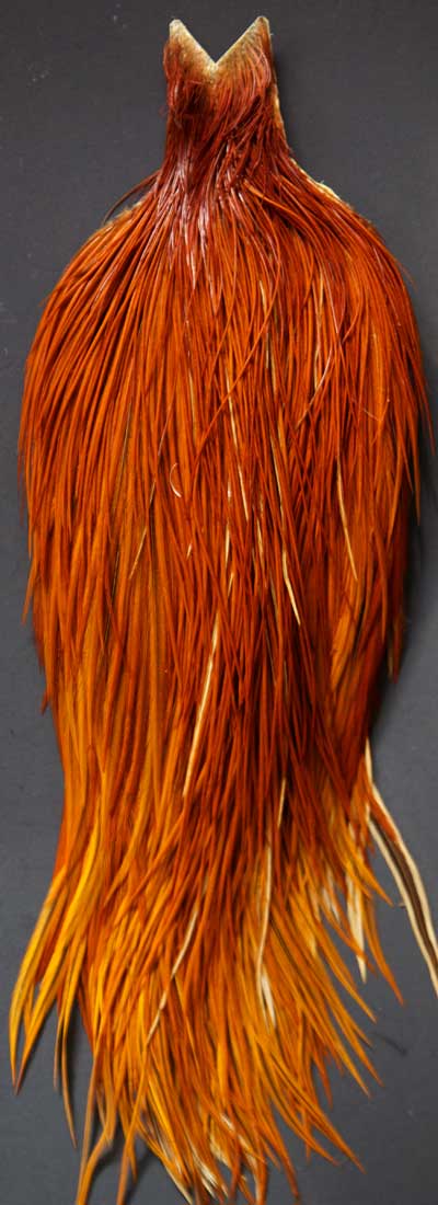 Here's a nice solid ginger cape. With a few dark ginger mixed in. This is a very nice cape full of small sizes. Just look at the length of the feathers! These Whiting capes are the same high quality capes you saw at the fly fishing shows. Graded on the old standard of #1, #2, and #3, according to the number of flies you can tie from the cape, you won't find a better deal anywhere!