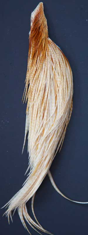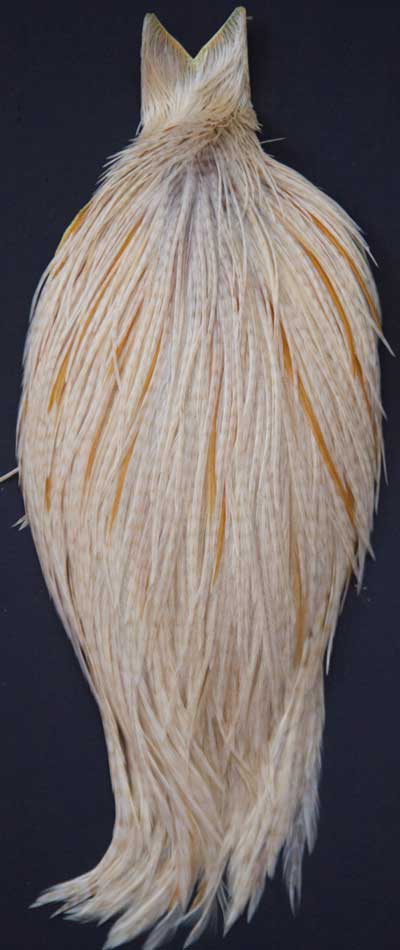 Here's a nice light ginger. The feathers on this cape are long, especially the small sizes. These Whiting capes are the same high quality capes you saw at the fly fishing shows. Graded on the old standard of #1, #2, and #3, according to the number of flies you can tie from the cape, you won't find a better deal anywhere!