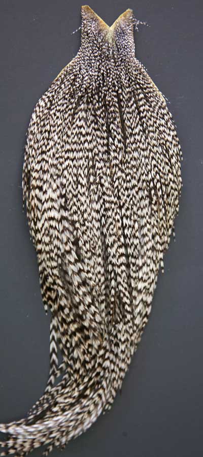 Certainly a different grizzly pattern on this one. Almost the appearance of fleckling. These Whiting capes are the same high quality capes you saw at the fly fishing shows. Graded on the old standard of #1, #2, and #3, according to the number of flies you can tie from the cape, you won't find a better deal anywhere!