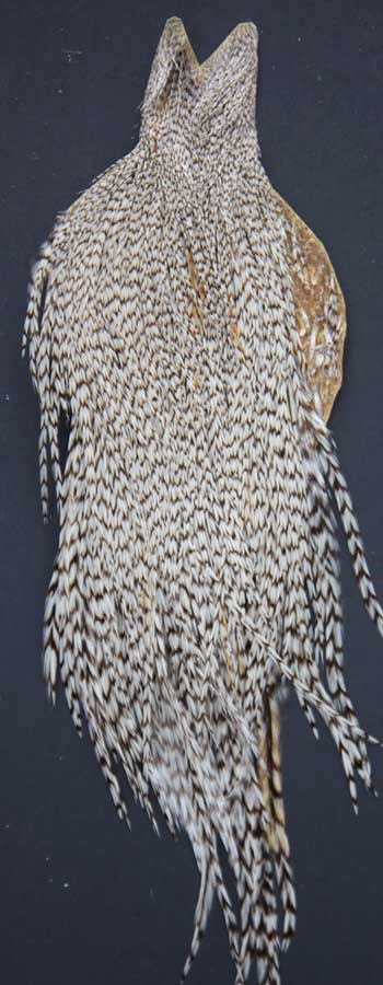 A perfect Hoffman style grizzly. smaller with lots of midge hackle. And thelighter color barring makes this a nice one. If you're looking for other colors, I stock quite a few. To see them all, visit my page; Whiting Dry Fly Show Capes.