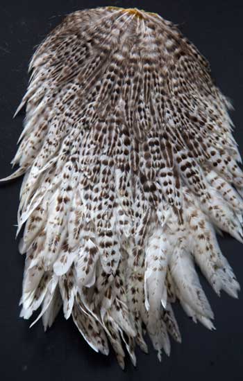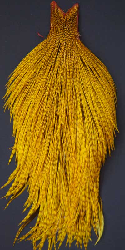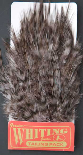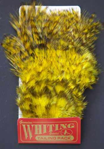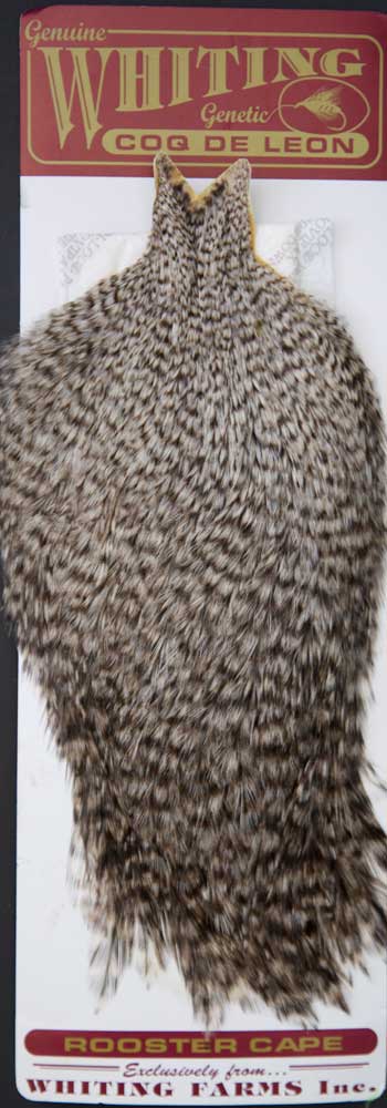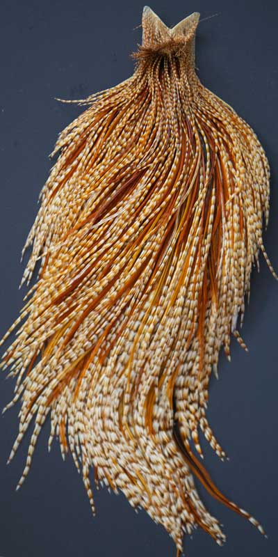 Here's about the only feather you can use for your hex patterns. It has the ideal fiber for tying those huge patterns. Some as long as 4's and 6's, you'll find nothing better. And dyed yellow, it's a hit! Nothing beats these feathers for tails and legs on any pattern you may be tying. The color is as close to the real thing as you'll find. Dating back to 1624, Coq de Leon, or the "rooster of Leon" is the oldest line of birds bred for their feathers. The beautiful long speckled fibers are stiff, almost having a glassy look. Whiting offers this color in both capes and saddles. To see the full selection , please visit my page; Whiting Coq de Leon.
