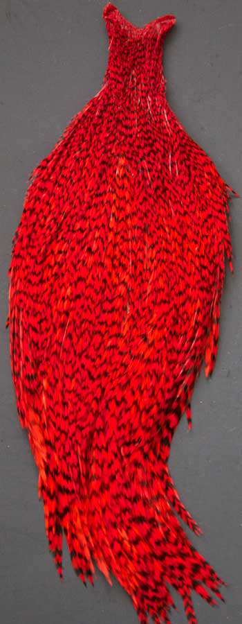 Grizzly dyed Red Grizzly dyed HiVis colors are a hot item these days. Many customers tell me how they use them to tie catskill patterns to fish off the piers for bluegills. Get a bluegill on a fly rod and you've got a fight on your hands! To see other colors, visit my page; Whiting Show Capes.