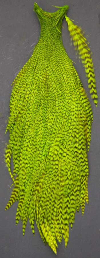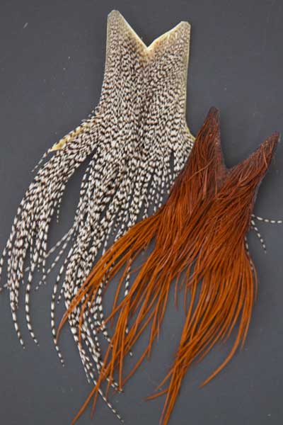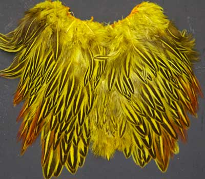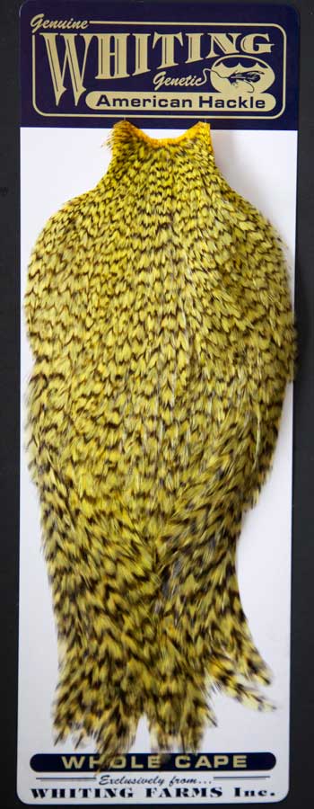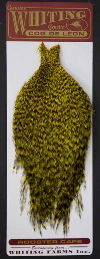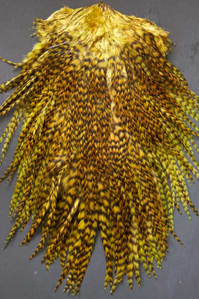 Here's about the only feather you can use for your hex patterns. It has the ideal fiber for tying those huge patterns. Some as long as 4's and 6's, you'll find nothing better. And dyed yellow, it's a hit! Nothing beats these feathers for tails and legs on any pattern you may be tying. The color is as close to the real thing as you'll find. Dating back to 1624, Coq de Leon, or the "rooster of Leon" is the oldest line of birds bred for their feathers. The beautiful long speckled fibers are stiff, almost having a glassy look. Whiting offers this color in both capes and saddles. To see the full selection , please visit my page; Whiting Coq de Leon.