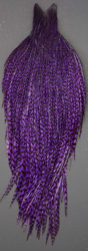 Grizzly dyed Purple Grizzly dyed HiVis colors are a hot item these days. Many customers tell me how they use them to tie catskill patterns to fish off the piers for bluegills. Get a bluegill on a fly rod and you've got a fight on your hands! To see other colors, visit my page; Whiting Show Capes.
